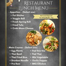 Great lunch specials! My favorite is the Thai chicken basil. Crab moon cheese wontons are a must with the lunch special. Great customer service as well.